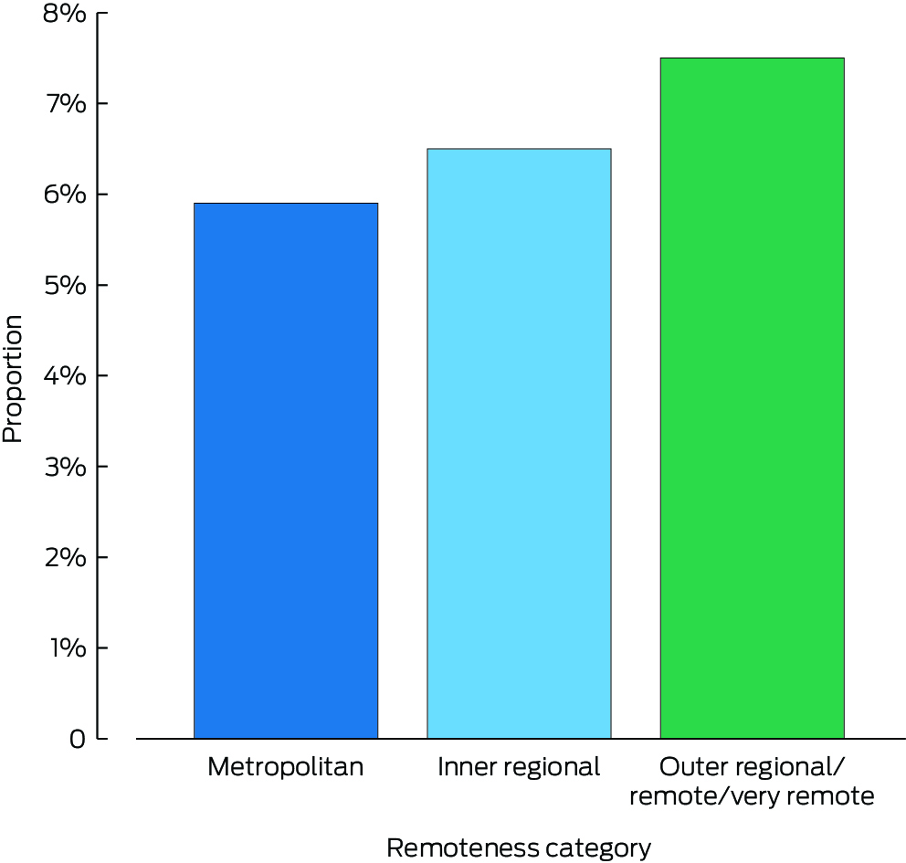 We stratified patients by region of residence (SA2) at the time of heart failure admission. We classified remoteness according to the Australian Statistical Geography Standard, a measure of relative access to services, with five categories;23 for this study, we defined three categories: metropolitan (= major cities; the reference group), inner regional, and outer regional/remote/very remote.