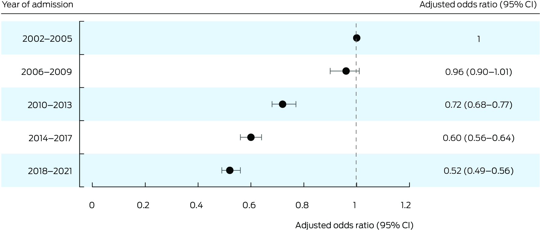 In‐hospital all‐cause mortality was lower during 2018–21 than during 2002–2005, both overall (aOR, 0.52; 95% CI, 0.49–0.56) (Box 3; Box 4) and for patients from metropolitan areas (aOR, 0.50; 95% CI, 0.46–0.55), inner regional areas (aOR, 0.53; 95% CI, 0.47–0.61), and outer regional/remote/very remote areas (aOR, 0.55; 95% CI, 0.44–0.69) (Supporting Information, figure 4).