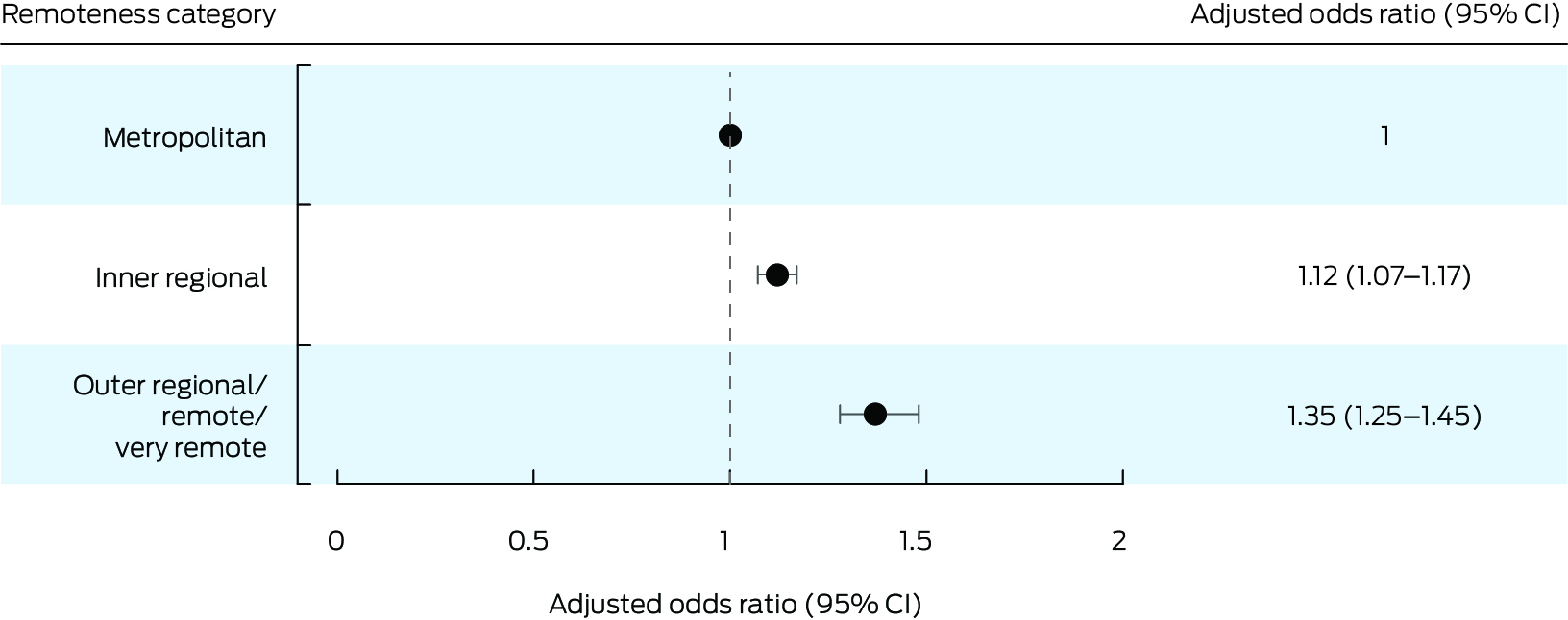 Compared with patients from metropolitan areas, the odds of in‐hospital death were higher for patients from inner regional (aOR, 1.12; 95% CI, 1.07–1.17) and outer regional/remote/very remote areas (aOR, 1.35; 95% CI, 1.25–1.45) (Box 5). Similar results were yielded by a multivariable model that additionally included CCI as a variable: inner regional: aOR, 1.15 (95% CI, 1.10–1.21); outer regional/remote/very remote areas: aOR, 1.37 (95% CI, 1.28–1.48) (Supporting Information, table 4). The odds of in‐hospital mortality were greater for people with a history of stroke (aOR, 3.47; 95% CI, 3.07–3.92) or malignancy (aOR, 3.06; 95% CI, 2.81–3.33) (Box 3).