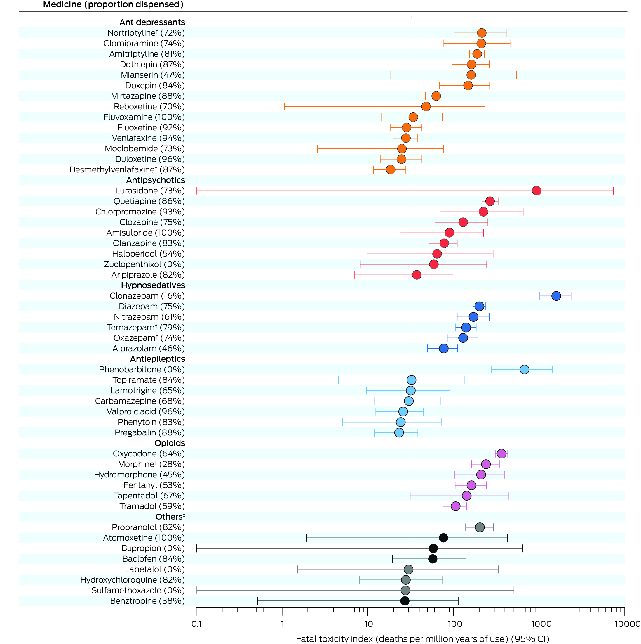Results: During 2013–19, 2132 deaths were classified as medicine poisoning suicide deaths (median age, 51 years [interquartile range, 39–64 years]; 1036 girls or women [49%]). The 5703 detected substances deemed to have contributed to death included 140 medicines. The overall FTI was 32.0 (95% confidence interval [CI], 30.6–33.3) deaths per million years of use; overall estimated case fatality was 1.28% (95% CI, 1.23–1.34%) of poisoning events. FTI and estimated case fatality (each log10 transformed) were moderately correlated (R 2 = 0.66). Both values were relatively high for most opioids, sedative psychotropics, and tricyclic antidepressants. Specific medicines with high values were phenobarbitone, oxycodone, morphine, clonazepam, nortriptyline, and propranolol; they were relatively low for risperidone and lithium. The proportions of opioids and hypnosedatives that had been recently dispensed to the deceased persons were smaller than for antidepressant, antipsychotic, and antiepileptic medicines.