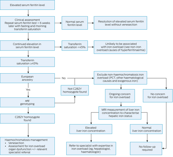 As shown in Box 2, if the repeat testing demonstrates both the serum ferritin level and transferrin saturation within the reference interval, no further action is required, as treatable iron overload disorders are highly unlikely.11,13,14 If the serum ferritin level and transferrin saturation are both elevated, further assessment should be undertaken for the presence of HFE‐related haemochromatosis, due to p.Cys282Tyr homozygosity, in individuals with European ancestry or if there is uncertainty regarding European ancestry. Likewise, testing for the HFE p.Cys282Tyr mutation is strongly suggested when there is a family history of haemochromatosis or iron overload,4,13 as p.Cys282Tyr homozygosity accounts for almost all HFE haemochromatosis in Australia, with the remaining genotypic variations of little or no clinical significance.13,14,15,16 Further diagnosis and management strategies for haemochromatosis are covered elsewhere.13,14 If HFE haemochromatosis is excluded, further assessment for the presence of porphyria cutanea tarda (PCT) or other haematological causes of iron overload is indicated. Where there is doubt as to the presence or absence of iron overload, quantification of liver iron concentration (LIC) using an available magnetic resonance imaging (MRI) method is indicated.17,18