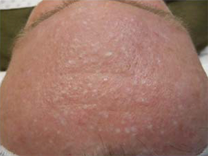 Figure 1: Patient’s facial fibrofolliculomas and trichodiscomas presenting as innumerable small white papules on the forehead, cheeks and chin.