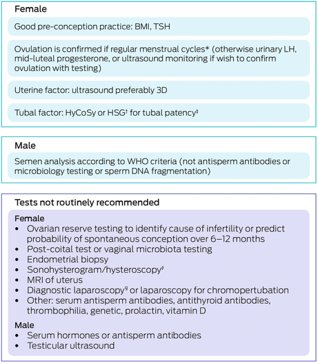 The guideline is conservative in terms of investigations. Considering benefits and risks, regular menstrual cycles may be an adequate indication of ovulation. Laparoscopy and hysteroscopy are not required in the absence of a relevant history of infection, pain or miscarriage. Ultrasonographic or radiographic visualisation of the tubes and uterus is less invasive, lower risk and less expensive than surgery, while providing adequate information. A standard semen analysis incorporating the World Health Organization criteria20 (without the need for DNA fragmentation testing) and the lack of evidence for testing for autoimmunity, other hormones and metabolites are key elements of the guideline.